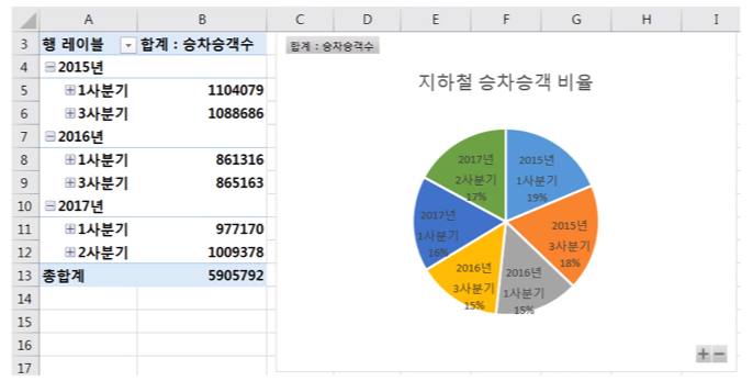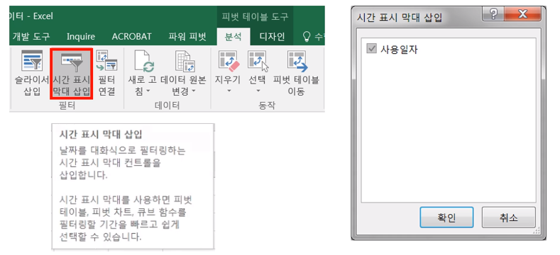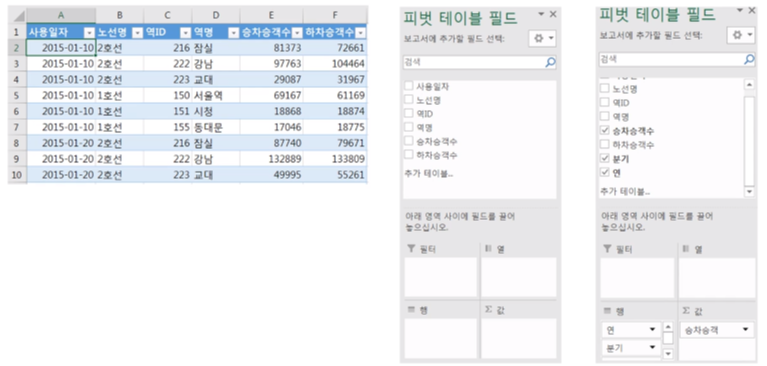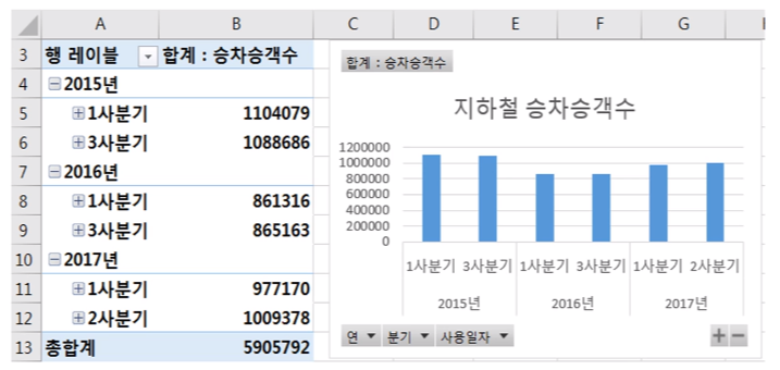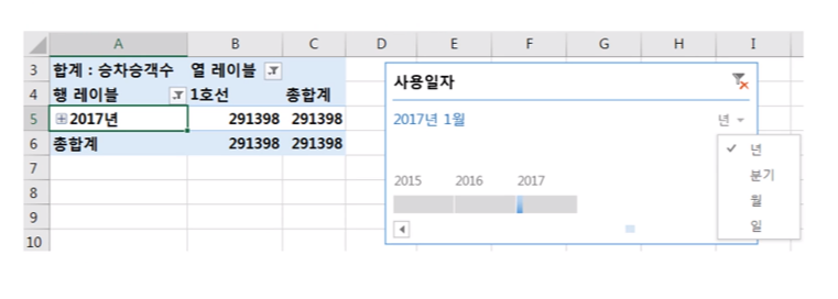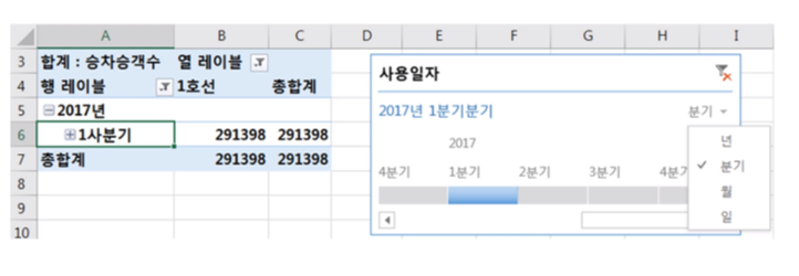 · '사용일자'을 '행'에 추가하자 '분기', '연'이 추가되었음