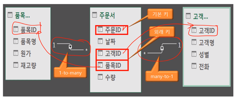 - 기본 키(Primary key) : 고유 값을 가진 필드 ex 고객ID