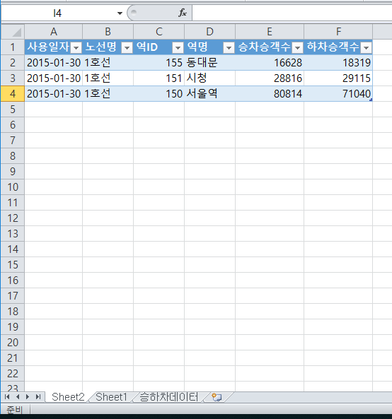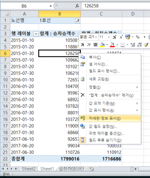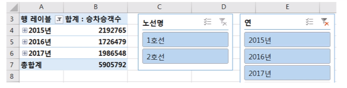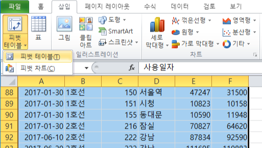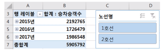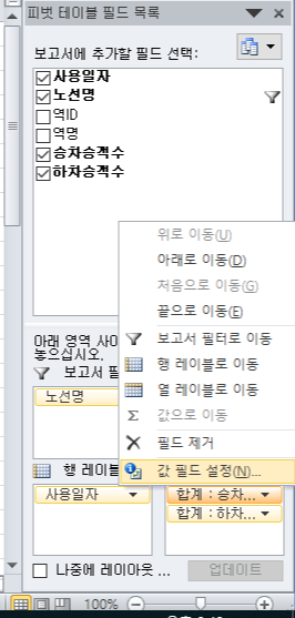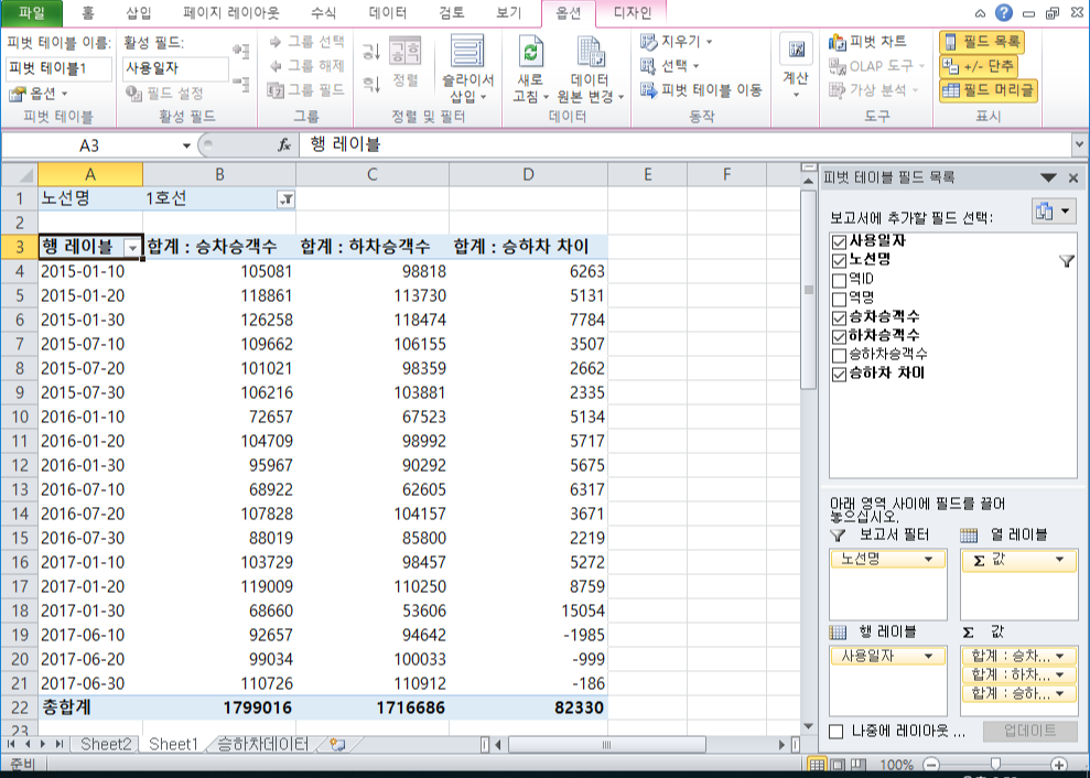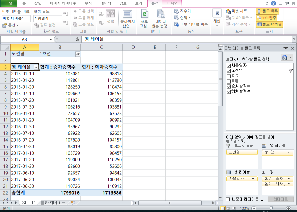 필터에 노선명, 행 레이블에 사용일자, 값에 승차승객수와 하차승객수를 집어넣음