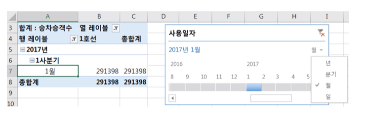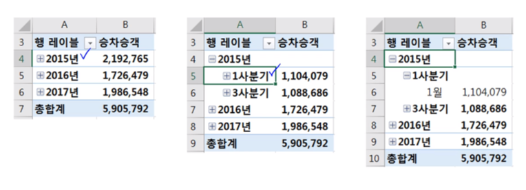 · 날짜/시간 데이터를 피벗테이블에 추가하면 자동적으로 데이터 그룹화