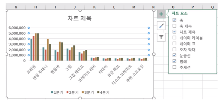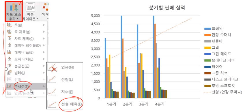 차트 요소 추가 -> 추세선 -> 선형 예측 (안장 주머니에 대한 추세선) ▶ 막대 차트에 그림 삽입