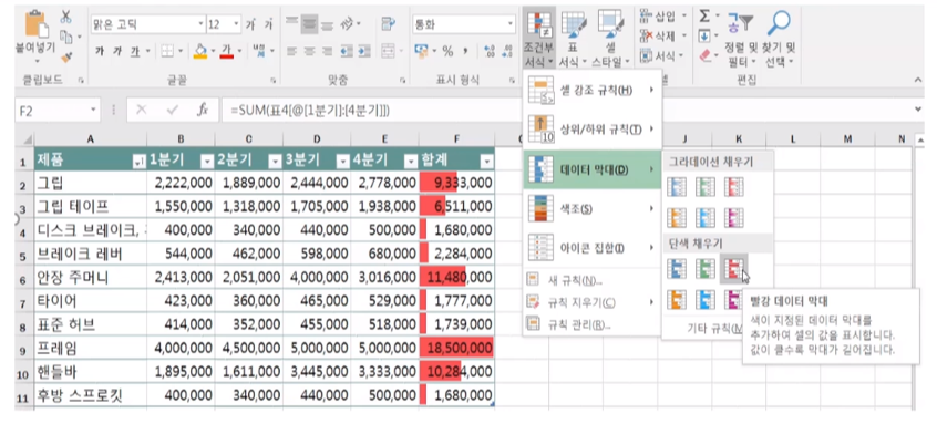 - 데이터의 추세 및 패턴을 쉽게 확인할 수 있도록 막대, 색, 아이콘으로 중요한 값을 시각적으로 강조합니다.