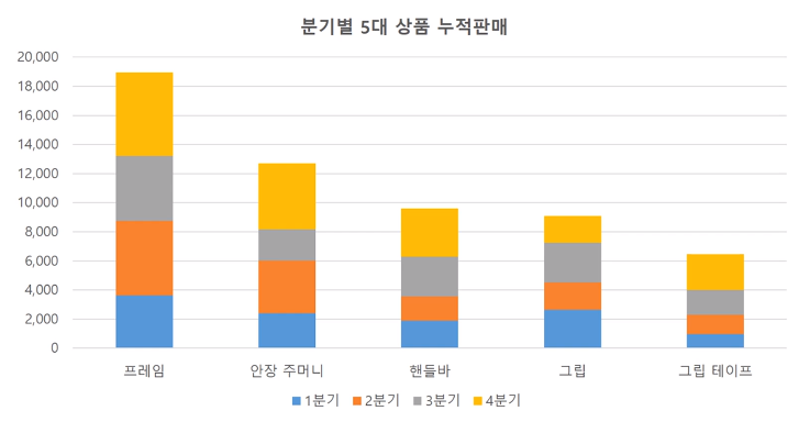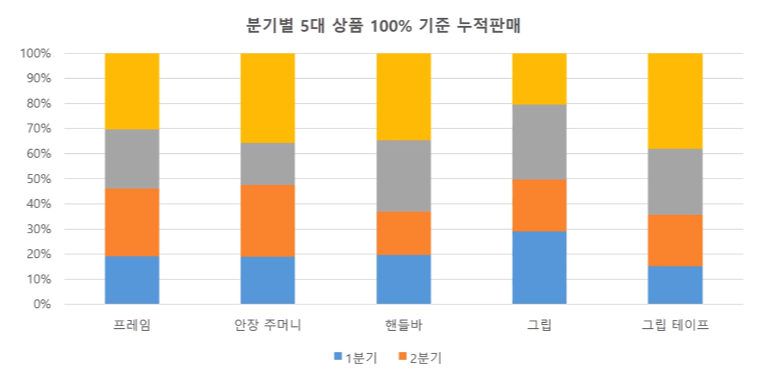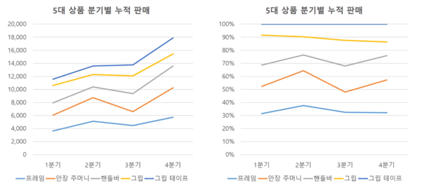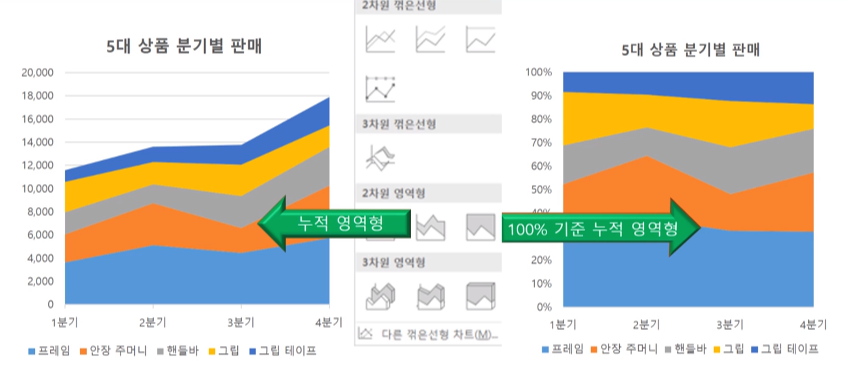 누적 꺽은 선형 차트 100% 기준 누적 선형 차트(분기를 100%로) ▶ 영역형 차트 (Area Chart)