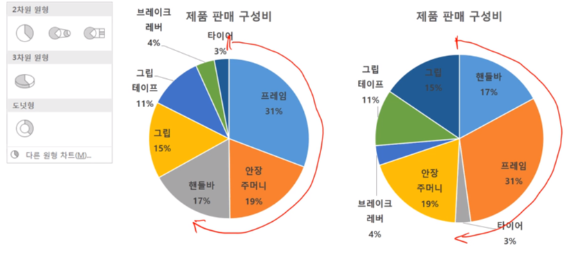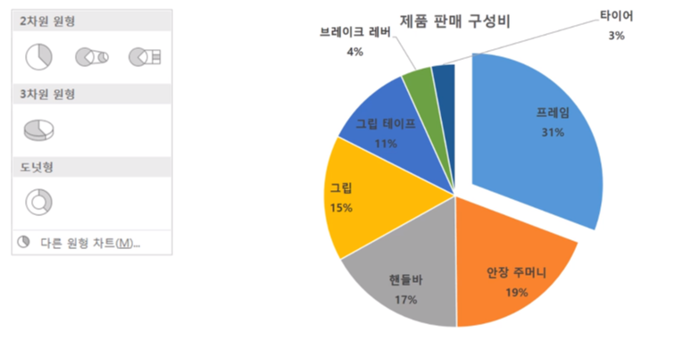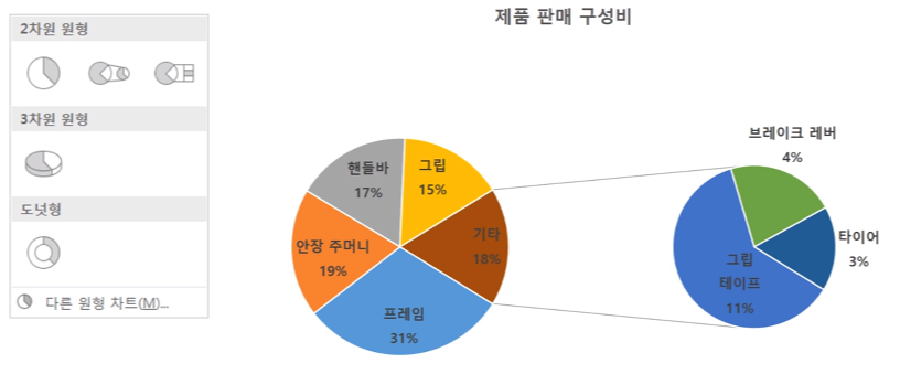 강조하기 위해 한 부분을 끌어 냄 원형 대 원형 차트 : 작은 비중의 부분을 별도로 표시함
