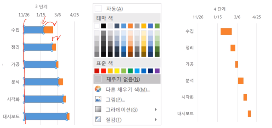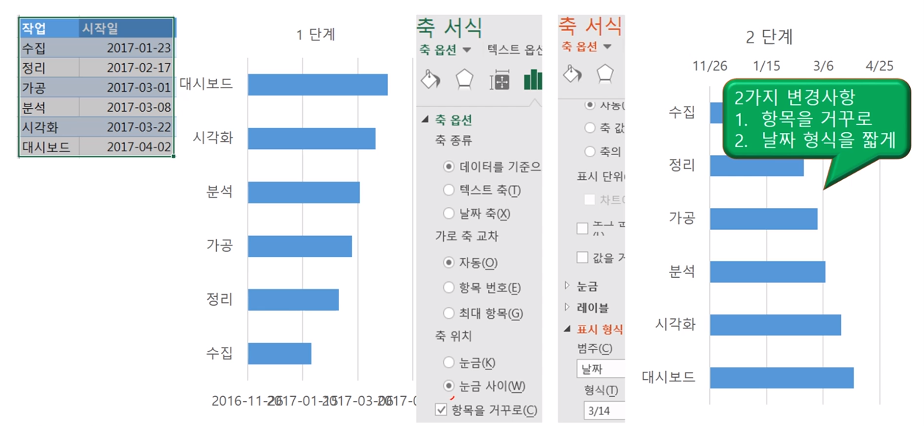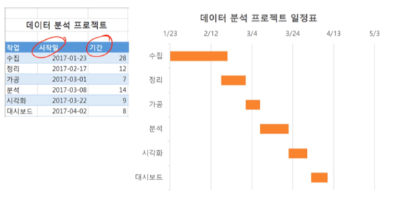 · (1) 작업의 순서, (2) 시작 시점, (3) 기간을 시각화함