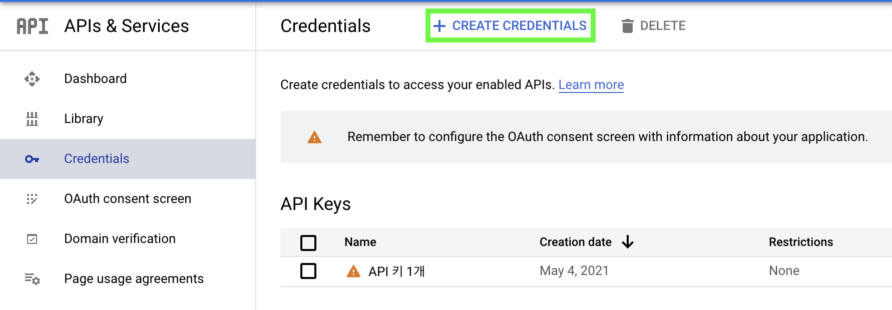 3. API Key를 생성합니다.