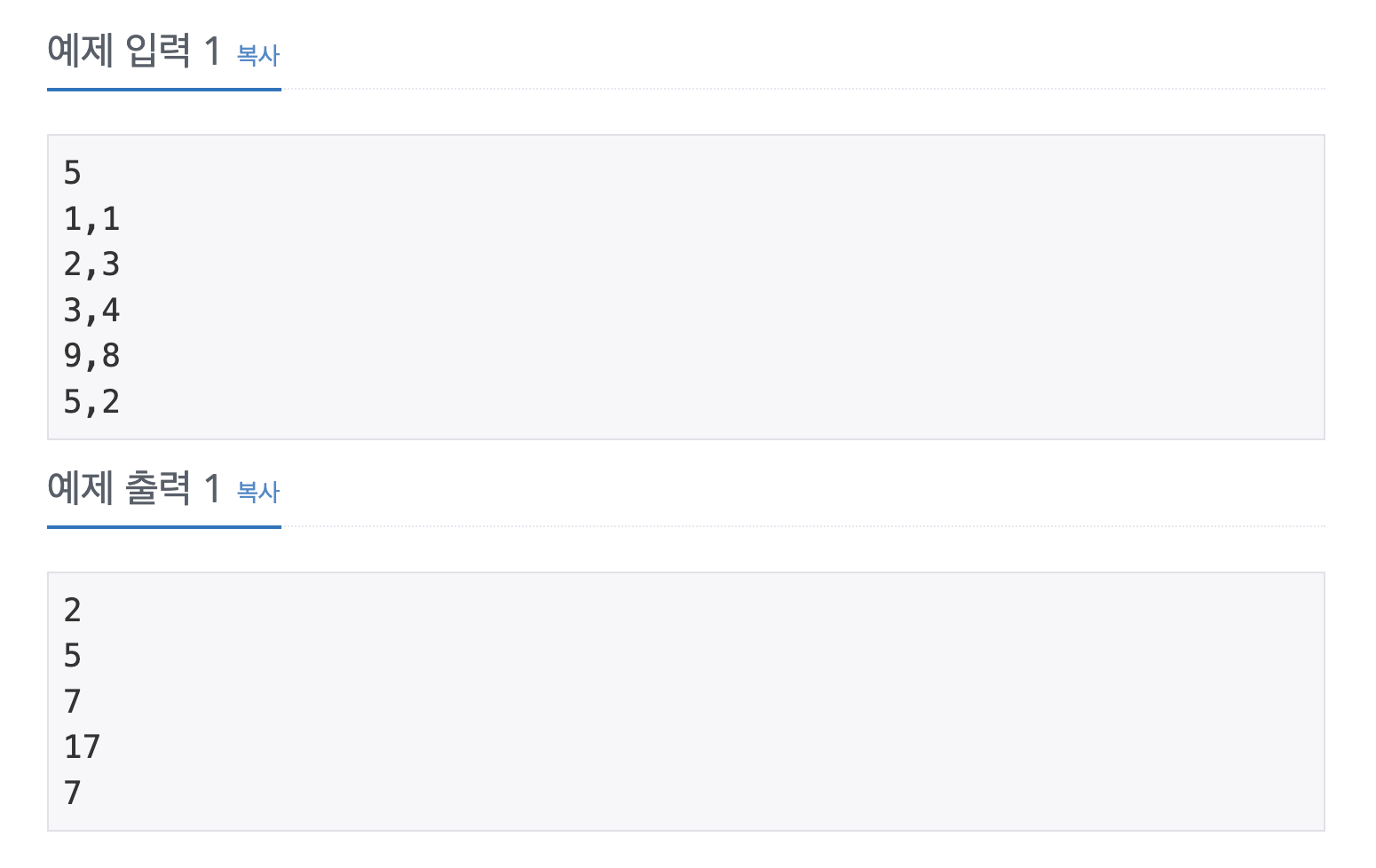 let inputT = Int(readLine()!)! for _ in 1...inputT { let inputNum = (readLine()?.split(separator: ",").map { Int($0)! })! print(inputNum[0] + inputNum[1]) }https://www.acmicpc.net/problem/10953