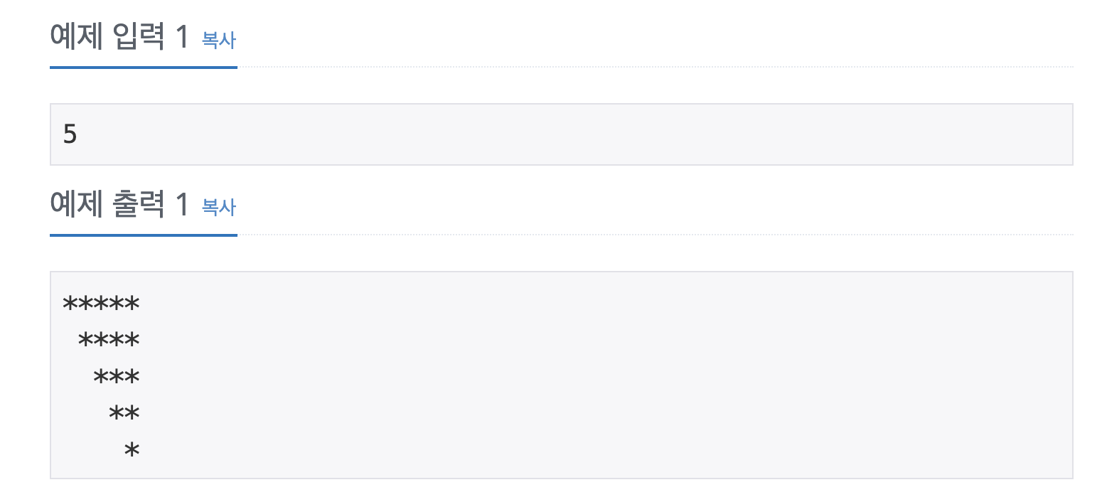 첫째 줄에는 별 N개, 둘째 줄에는 별 N-1개, ..., N번째 줄에는 별 1개를 찍는 문제 하지만, 오른쪽을 기준으로 정렬한 별(예제 참고)을 출력하시오.