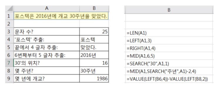 - MID(text, start_num, num_chars) : 지정위치에서 지정한 수만큼 추출